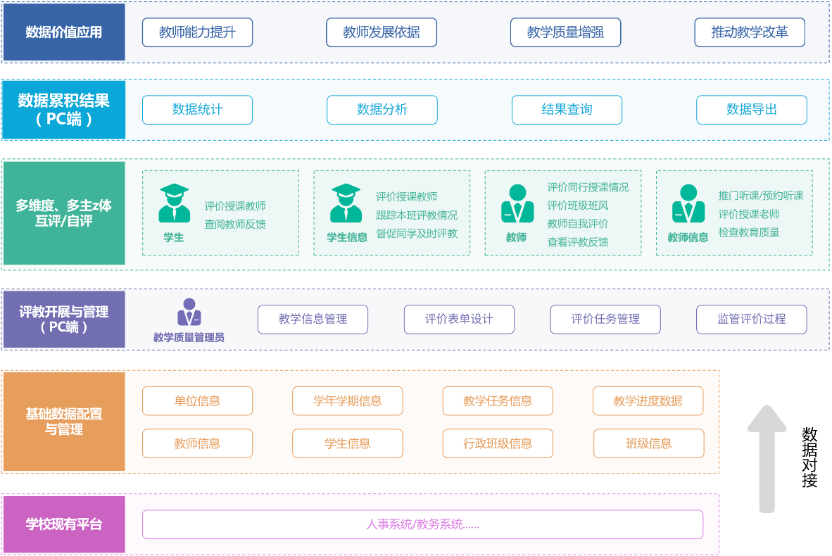 教學質量評價與反饋系統,以過程性評價+結果性評價為導向,依托多維度評價指標,多人員互評,多次數累積評價,全方位地對課堂教學進行監管與評價,實時便捷地對教學情況進行反饋,協助學校高效開展線上教學評價工作,為學校進一步提高教學質量提供強大的技術支持和數據依據。