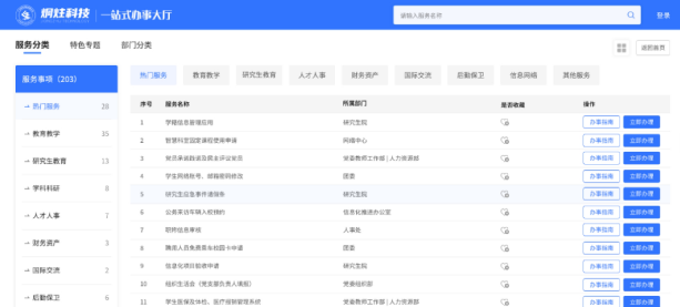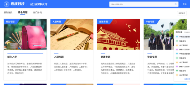 按域、部門、專題不同形式展示全校的系統(tǒng)入口、流程申請、常用查詢等服務(wù),方便用戶快速查詢。